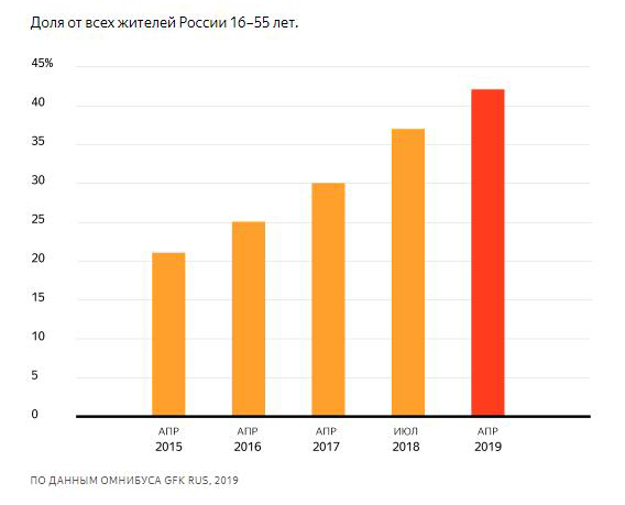 Было время, когда многие сомневались, стоит ли покупать через интернет даже книжку – психологически было сложно купить что-то, заплатив вперед и даже не пощупать руками. Теперь список продаваемых через интернет товаров бесконечен, а онлайн-покупки всё чаще делаются «на ходу», со смартфонов и планшетов. В 2019 году доля россиян в возрасте от 16 до 55 лет, заказывающих товары онлайн, составила 42% — в два раза больше, чем в 2015 году. Согласно мнению аналитиков, объем продаж через интернет каждый год увеличивается в среднем на 20%, и в этом году цифра перевалит за 50%.